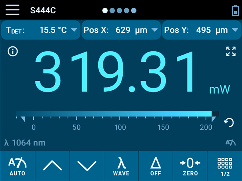 - Numerical: a digital readout of the overall power measurement for the entire sensor, displayed in W, V, or dB. The beam position coordinates are also shown in the upper right of the screen.