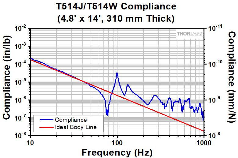 (posted 2020-06-09 08:54:38.0) Response from Charles at Thorlabs: Thank you for your query and for bringing this to our attention. It appears that the uploaded graphs may be incorrect. Certainly I can see that many of the graphs for the 460 mm tables have equivalent metric and imperial scales which is not correct. The 460 mm thick tables should indeed have a lower compliance curve and we will upload graphs with the correct information as soon as possible.