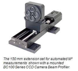 Das BC1M2 Erweiterungssets ist für einen Verschiebebereich von 150 mm oder 300 mm verfügbar. Aus dem neuen Erweiterungsset BC1M2, einem BC100 Kamera-Profiler und einigen opto-mechanischen Standardkomponenten zur Strahlführung kann in wenigen Schritten ein Komplett-System aufgebaut werden. Mit diesem können M²-Messungen nach ISO 11146 oder Strahldivergenz-Messungen vollautomatisch in weniger als 1 min. mit Genauigkeiten unter 5% durchführt werden. Das System eignet sich für Laser im CW oder Pulsbetrieb.