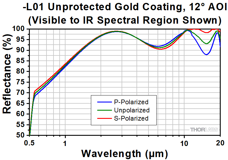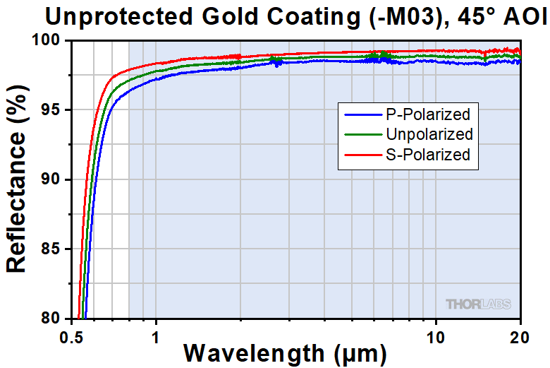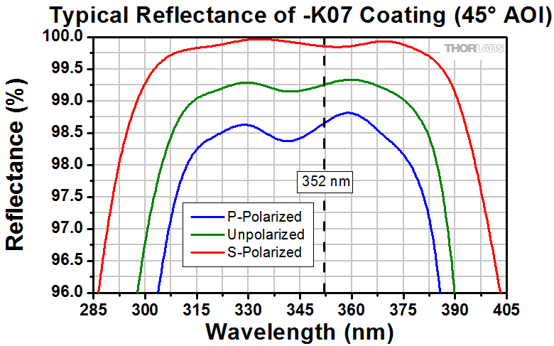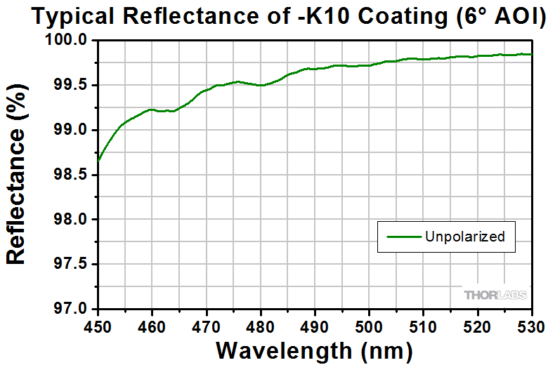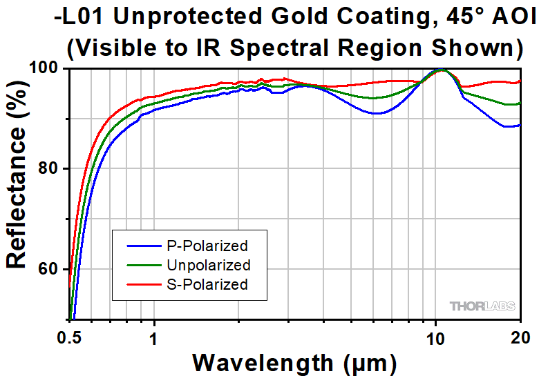 The reflectance of surfaces can be greatly improved by the addition of an HR coating; however, performance will depend on both the wavelength and the angle of incidence (AOI). At high AOIs, the performance will also depend on the polarization of the incident light. Information about the reflectance of each HR coating can be found in Tables 4.3, 4.4, and 4.5.