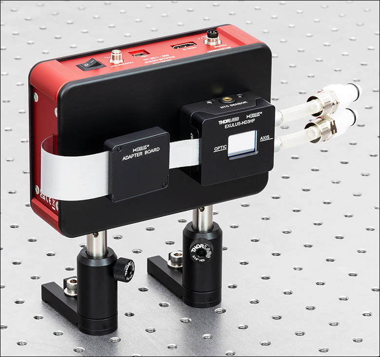 These high-power spatial light modulators have input ports compatible with HDMI* connectors and ship with two corresponding cables: one for connecting to an HDMI-compatible output, and one for connecting to a DisplayPort*-compatible output. A mini-USB cable is also included for connecting to a PC. To aid in connecting to a liquid chiller, two CPC valved quick-connection fittings for both 4.3 mm (0.17") and 6.0 mm (0.24") inner diameter hoses are included with the unit, as well a 2.5 mm stereo cable for thermistor compatibility. A power supply with a location-specific power cord, a USB drive with the software and manual, and a BD-2M 2 mm balldriver for removing the SLM head from the main body are also shipped with these Exulus models.