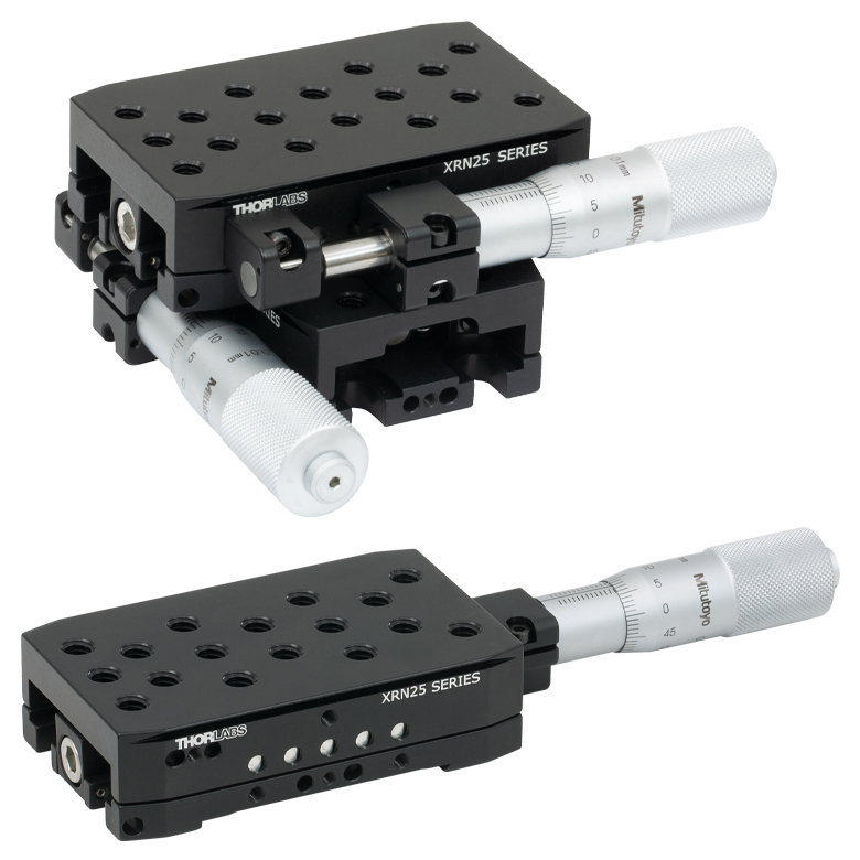 Thorlabs' XRN25 Series Compact Translation Stages provide 25 mm of linear translation with less than 150 µrad of deviation per axis in pitch and yaw over the full range of the stages. These stages use crossed-roller bearings to support precision motion and high load capacities. The top and bottom plates are machined from cast tool and jig aluminum for minimal internal stress and improved stability. The stage position can be locked into place via a lock plate.