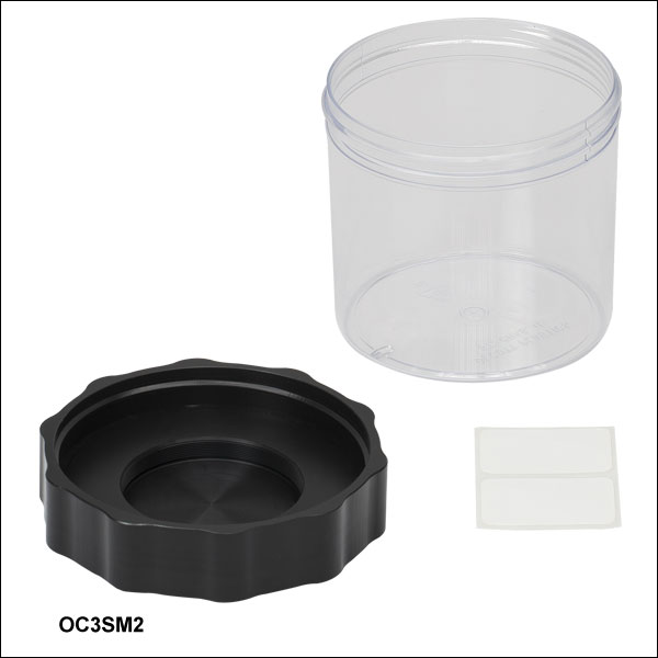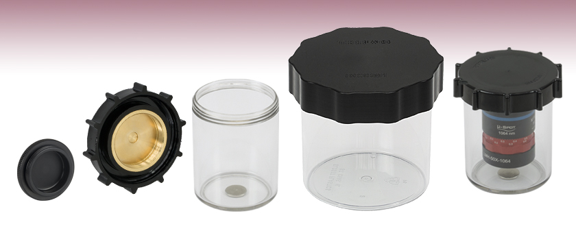 Each lid has a brass insert with internal threading to secure the objective. They are designed with large external ridges to reduce the likelihood of the canister rolling when on its side and include an adhesive label for noting the stored objective. Canisters are offered in two lengths; the maximum allowed objective length is measured from the shoulder to the tip (end) of the objective and does not include the threaded portion. The bottom of each canister has an integrated magnet for stability when upright on an optical table. Polycarbonate should only be cleaned with ethanol, methanol, or isopropyl alcohol. Acetone and other solvents may damage the material.