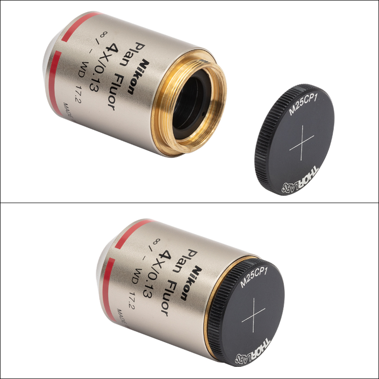 The internally threaded RMSCP1 cap and externally threaded RMSCP2 cap can be used with standard RMS-threaded microscope objectives and lens ports, respectively. The internally threaded M25CP1 cap and externally threaded M25CP2 cap can be used with standard M25 x 0.75-threaded microscope objectives and lens ports, respectively. Both M25CP1 and M25CP2 caps feature an alignment engraving to aid in the alignment of visible beams.