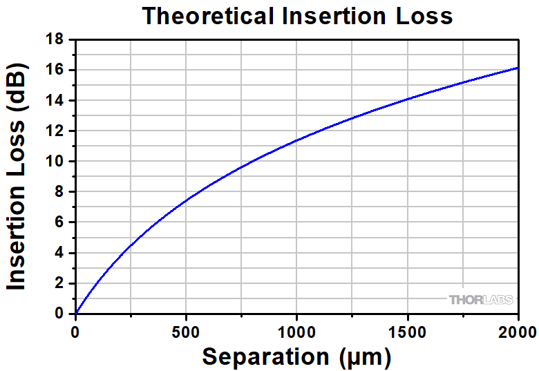 where z is the separation distance, a is the radius of the core size in µm, NA is the numerical aperture of the fiber, and n0 is the index of the core. Click here to download an interactive Excel file which can be used to calculate and graph the theoretical insertion loss for any fiber.