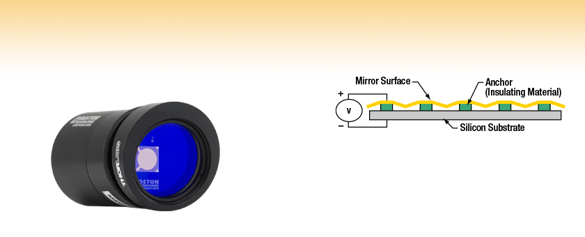 This Micro-Electro-Mechanical (MEMS) Grating Modulator, manufactured by our strategic partner Boston Micromachines Corporation, has controllable groove depth which modulates intensity. This reflective, low-modulation MEMS grating acts as a metallic plane mirror when no voltage is applied and becomes a deformable reflective one-dimensional grating with controllable groove depth when voltage is applied for advanced optical control. The circular Ø6.0 mm gold coated region shown in Figure 1.1 is the active aperture that consists of an array of electrostatic actuators. The grating modulator can achieve a high extinction ratio of 200:1 in the 600 - 1100 nm wavelength range at a 10° angle of incidence (AOI) or less (see the Graphs tab for more information). A 10° angled WG11050-B window that is AR coated for the 650 - 1050 nm range protects the device.