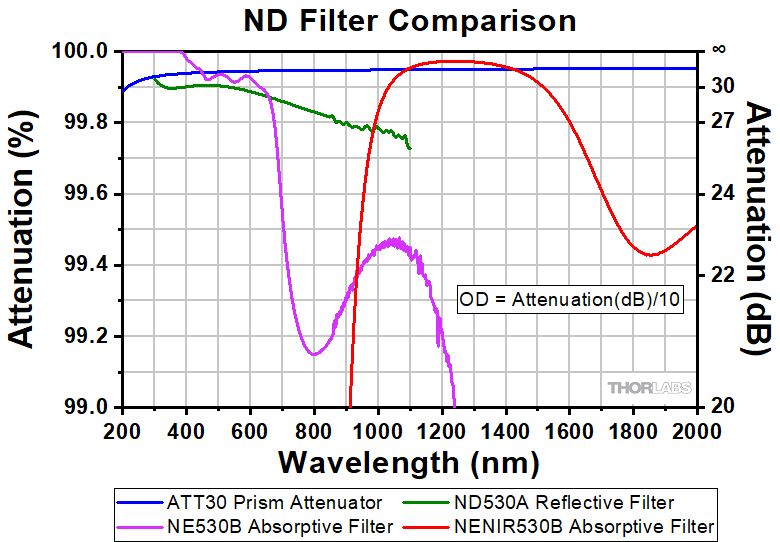 The graph above is a comparison of ATT30 series prism attenuators with our reflective and absorptive (visible and near-IR) neutral density (ND) filters with optical density (OD) = 3.0. Note that OD = (attenuation in decibels)/10.