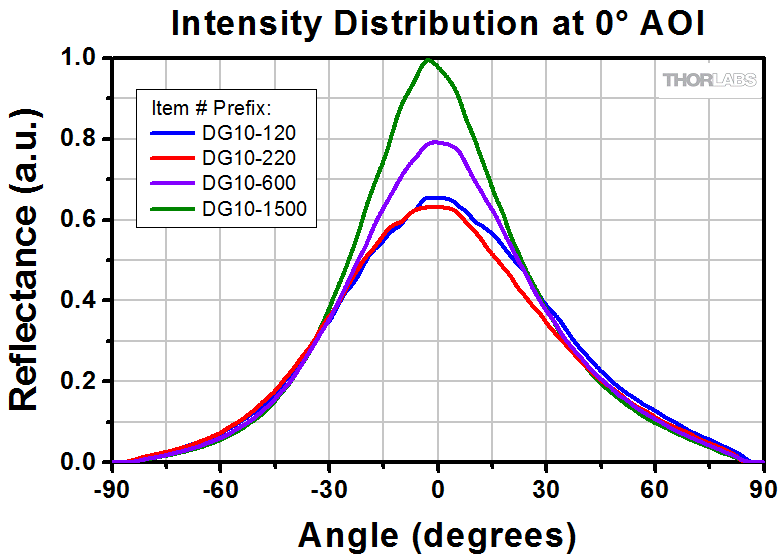 For each grit available on this page, we have provided data showing the reflected intensity distribution for four AOIs. Intensity distributions were measured with a collimated source at a 0°, 15°, 30°, or 45° AOI. The gap in each curve represents the AOI of the light source. The intensity measurements were normalized by setting the peak measured value for the 1500 grit diffuser with the source at a 0° AOI equal to 1.
