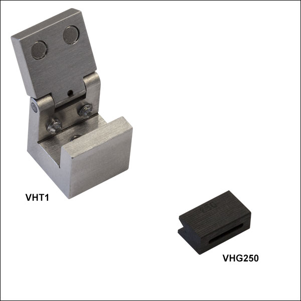 The VHT1 clamp secures transfer inserts with a magnetic lid that prevents axial movement of the fiber and can be used to hold the insert during transport without touching the fiber itself. For fibers with diameters ≤550 µm, a graphite V-groove is available to support the fiber when splicing (please see Table G4.1 for more information). To provide extended support along the length of the fiber and reduce the amount of overhang during processing, we also offer 0.594" long V-grooves (Item #'s VHG125L, VHG250L, and VHG500L). The graphite V-grooves are secured by tightening two setscrews on the transfer insert. For information on how to assemble transfer inserts, see the Fiber Holder Inserts tab.