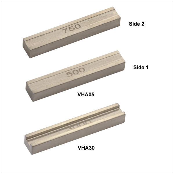 Example: For the Ø800 µm example fiber from step 1, the green cell is in the 750 µm groove column for the VHA05 top insert, which has two grooves. The numbers listed in the green cell indicate that this combination of inserts is good for fibers from 728 to 963 µm in diameter. Our Ø800 µm fiber is within this range, so this is a good choice. There are several other options that will accommodate a Ø800 µm fiber as well, but the green shading in the chart indicates that the 750 µm groove in the VHA05 provides the best fit. - The second line of numbers in each cell shows the range of offsets that can be expected for any given combination of top and bottom inserts. When selecting inserts for the right and left fiber holding blocks, try to minimize the offsets between the pairs of inserts on each side.