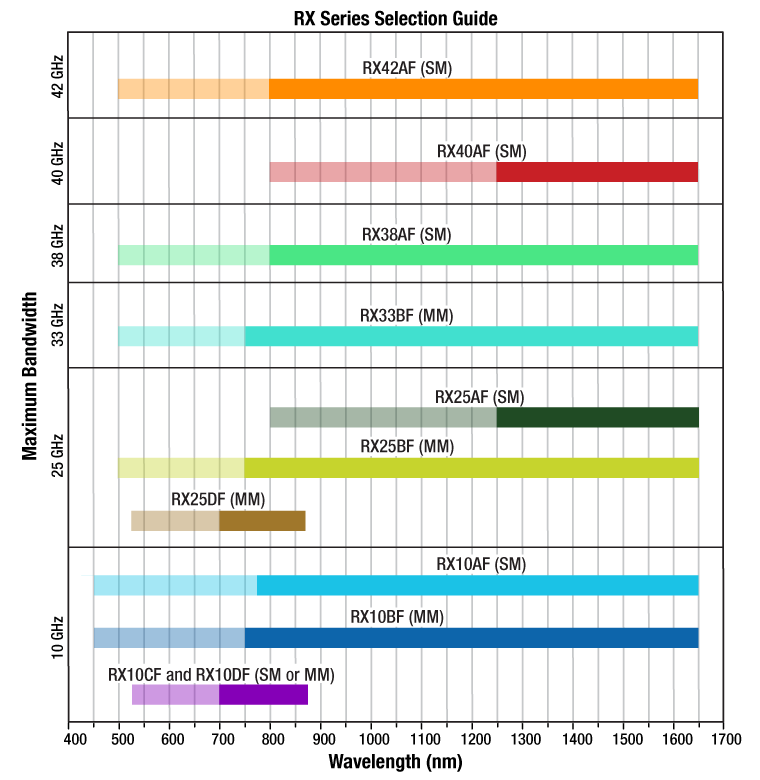 Figure 1.1 While each RX Series model is designed and intended for operation over the specified wavelength range shown by the solid colored regions, each will respond with reduced performance to optical inputs at shorter wavelengths, as shown by the partially transparent regions.