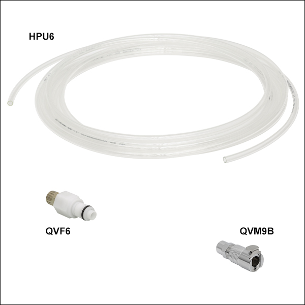 The 5 m Long Polyurethane (PU) Hoses have an inner diameter (ID) of 11/64" or 1/4" and outer diameter (OD) of 1/4" or 3/8". These hoses can be used at temperatures from -15 to 60 °C. These hoses are intended to be used alongside our in-line 1/4" OD or 3/8" OD coupling inserts and bodies. The HPU6 1/4" OD hoses are compatible with 6 mm ID push-fit pipe fittings such as those on our metric water-cooled breadboards.