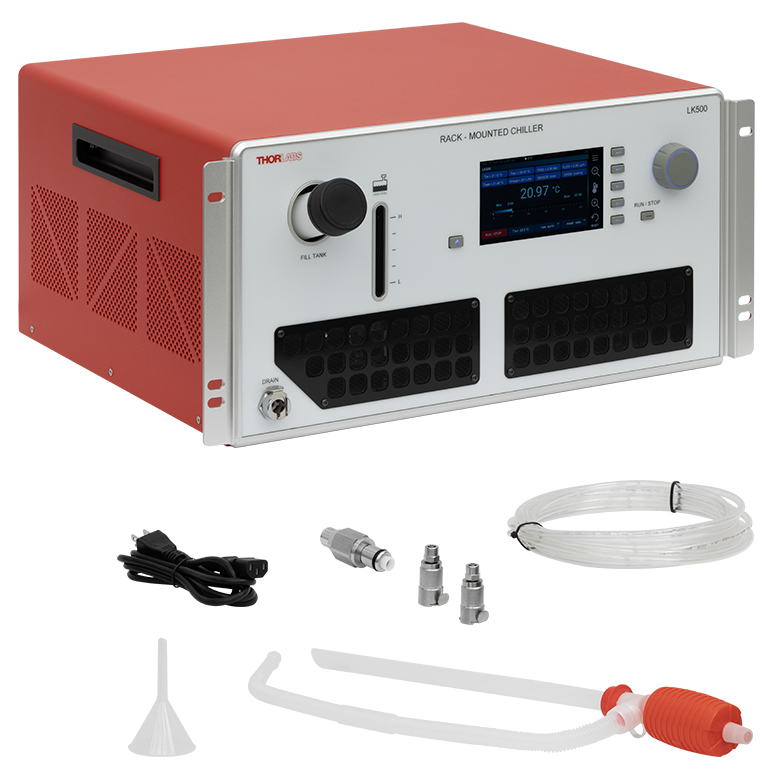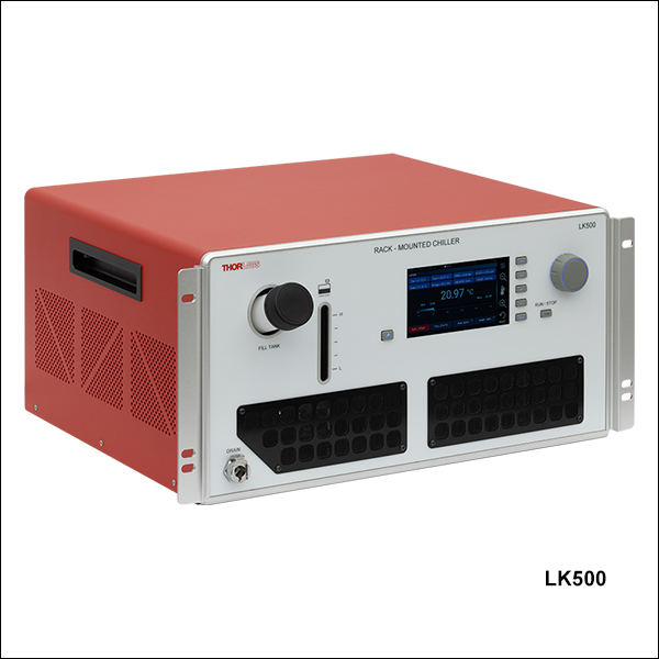 Thorlabs’ LK500 Rack-Mounted Chiller is an air-cooled liquid chiller that provides up to 500 W of cooling, 0.8 bar (11.6 psi) of pumping capability, and ±0.1 °C temperature stability. This compressor-refrigerant liquid chiller uses the environmentally friendly R290 as a natural refrigerant.