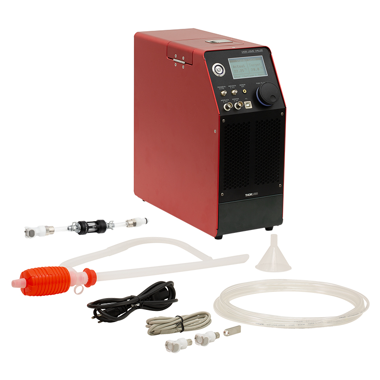 Thorlabs’ LK220 Thermoelectric Liquid Chiller is an air-cooled liquid chiller that provides up to 200 W of cooling, 1.2 bar (17.4 psi) of pumping capability, and ±0.1 °C temperature stability.