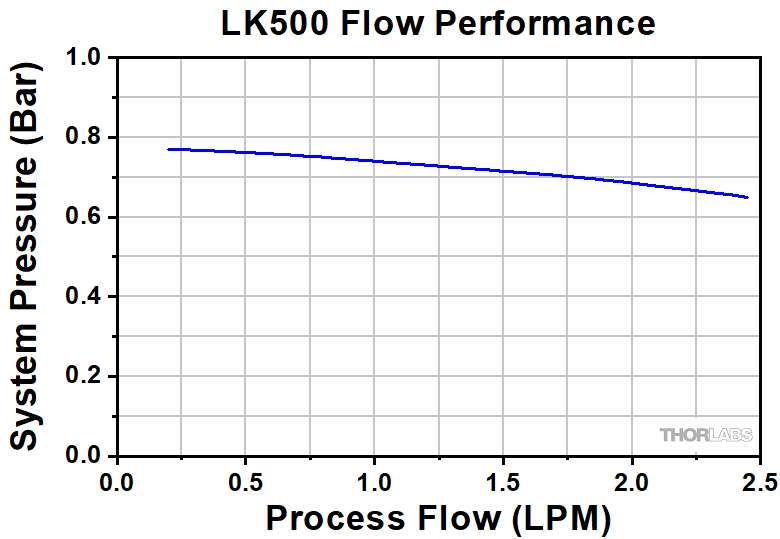 Figure 3.3 Flow performance demonstrates the pumping capability of the LK500 chiller running at 100% pump power, and process flow is measured in Liters per Minute (LPM). Measurements are taken at 25 °C ambient temperature with water used as coolant. Note that the kinematic viscosity of CDTX Coolflow DTX is approximately twice that of water and will result in less than half the flow performance.