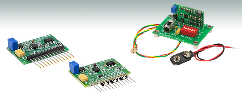The LD1100 and LD1101 Laser Diode Drivers are constant-power laser driver modules that support common laser anode and common laser cathode pin configurations. They feature an on-board 12-turn trim pot for continuous laser power output adjustment, pin-programmable feedback gain, ON/OFF control input, and a current monitor output for observing the laser drive current. With dimensions of only 1" x 1.5", they are compact and can be embedded into custom designs. The compliance voltage, which is the maximum output voltage, is ~6.5 V for the LD1100 and LD1101 when using a 12 V power supply. All input and output signals are provided on a 12-pin SIP connector, which allows simple integration into a printed circuit design.