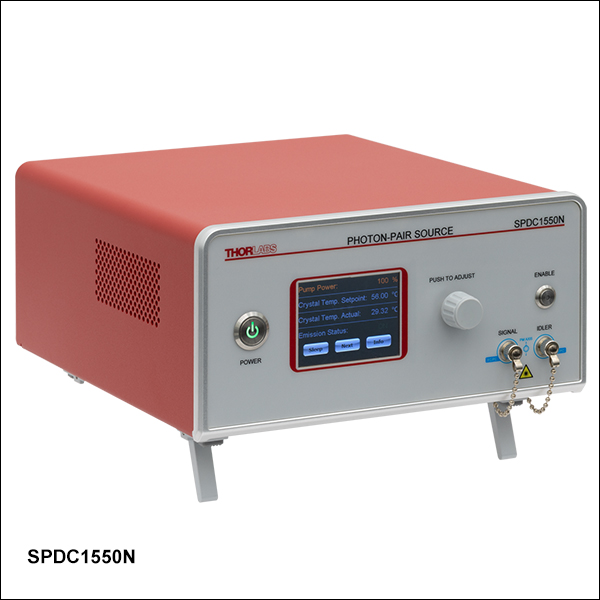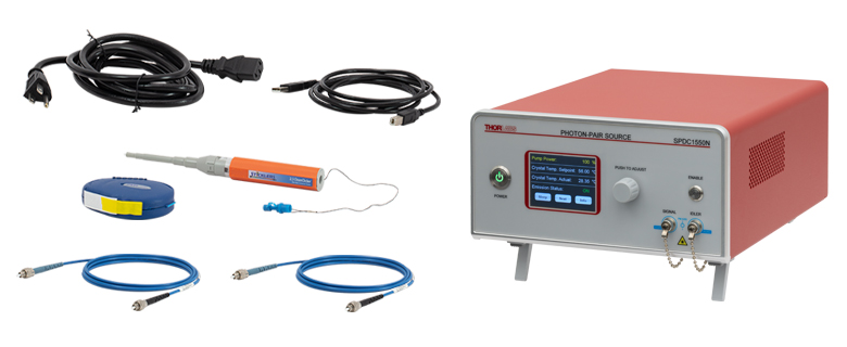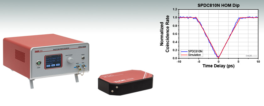 Thorlabs' Correlated Photon-Pair Sources generate a pair of photons near 810 nm or 1560 nm (C-band). Each source contains an integrated, user-adjustable pump laser for turnkey operation capable of high-brightness photon-pair generation rates. The SPDC810N and SPDC1550N narrowband sources generate photon pairs with 0.25 nm photon bandwidth at a rate of >100 000 coincident pairs per second and a heralding ratio of >0.30. Comparatively, the SPDC810 source generates photon pairs with a broader ~10 nm photon bandwidth but at an increased rate of >450 000 coincident pairs per second and a higher heralding ratio of 0.45.