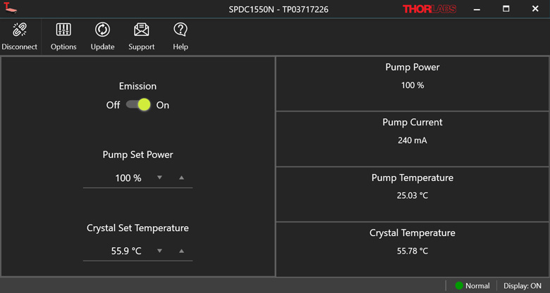 The SPDC software provides a simple GUI, which automatically identifies the connected photon-pair source and allows control of the pump power and emission. The GUI also displays the pump power, current, and temperatures, allowing the user to check the state of the device at a glance.