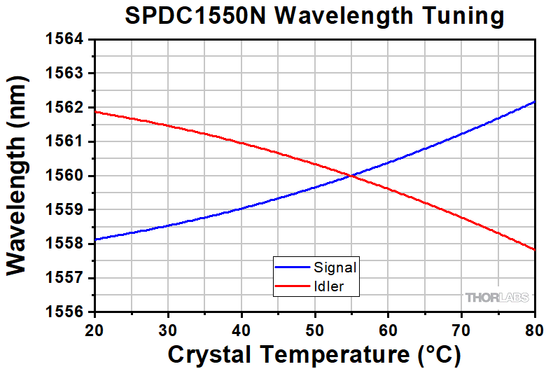 • While the degeneracy wavelength is fixed, tuning the crystal temperature away from the degeneracy point shifts the signal and idler wavelengths so they are no longer identical.