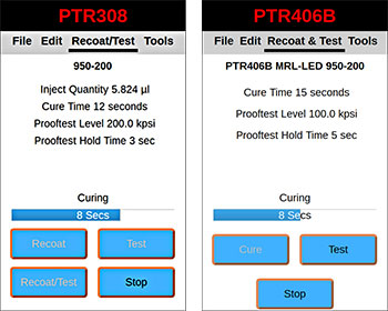Figure 3.2 The Recoat and Test screen will display the status of the process that is running. The Stop button can be used to end the active Recoat or Test process. During a proof test and the injection process, the handset controller shows the parameters configured on the Edit tab.
