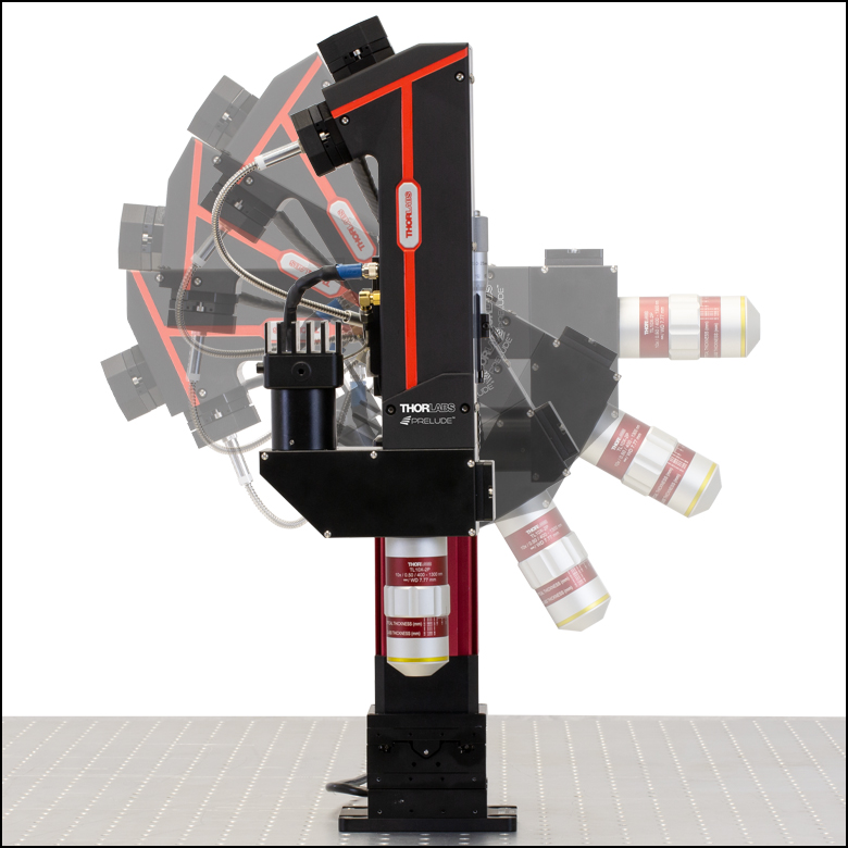 Ushering in a new level of flexibility for functional imaging, Thorlabs has created a completely integrated two-photon microscopy system suitable for samples with demanding positioning requirements. The Prelude® Functional Imaging Microscope offers motorized XYZ translation and manually operated rotation through a ±90° range, providing multi-axis access to samples at non-vertical angles. Its compact fiber-coupled design eliminates the need for complex alignment procedures and provides a high degree of maneuverability.