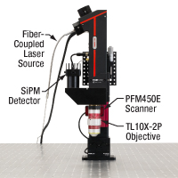 A near-infrared 920 nm femtosecond pulsed laser and integrated filter set are ideally suited for two-photon fluorescence imaging of GFP. The fiber-coupled laser source allows for easy assembly, disassembly, and relocation of the system compared to multiphoton microscopes that use free-space laser beams and mirrors. Two microelectromechanical system (MEMS) scanners provide 4.7 kHz resonant-MEMS scanning with low noise.