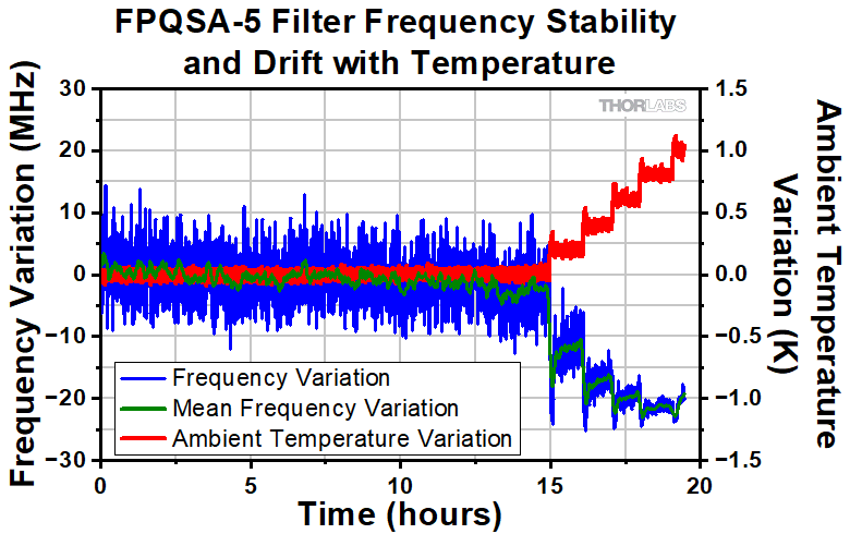 These filters are designed to be set and stabilized at a particular resonance frequency by keeping the temperature constant with a temperature controller, such as the TC300B heater and temperature controller (see Applications tab for details). In order to keep the temperature constant, the TC300B controller's PID parameters in the temperature control loop must be optimized. These parameters depend on the operating temperature, environmental temperature, and variations from device to device. See section 4.6 in the FPQSA manual for the recommended procedure to set the PID parameters. The resonant transmission can also be slowly tuned to particular frequencies by adjusting the temperature. Figure G2.1 shows the frequency variability of the FPQSA-5 filter controlled by a TC300B controller while kept in a temperature-controlled chamber. The response shows that the performance of the temperature-controlled filter can only be guaranteed when the ambient temperature remains stable within ±0.2 K.