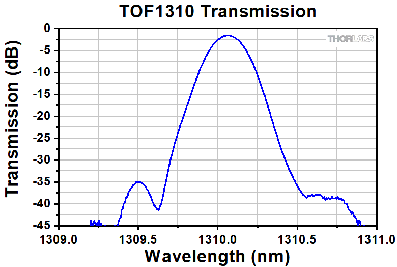 Thorlabs’ TOF1310 filter is a tunable Gaussian bandpass filter designed to operate with telecommunication O-band (1265 - 1355 nm) signals. The center wavelength of the bandpass can be tuned to any position within the operating wavelength range by selecting the wavelength directly.