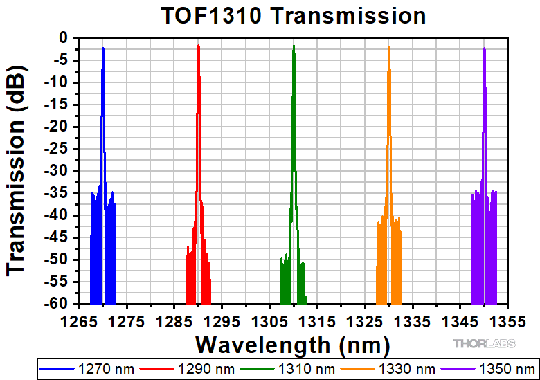 Figure 3.1 The plot above shows the transmission of the TOF1310 tunable filter with the passband tuned to five different center wavelengths: 1270, 1290, 1310, 1330, and 1350 nm. The transmission is found by measuring the insertion loss.