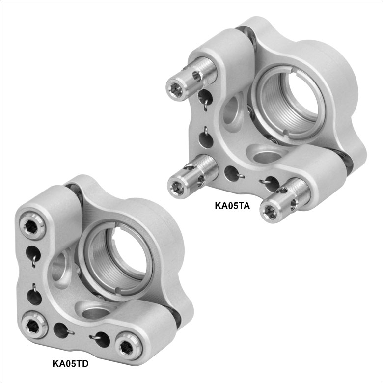 For fitting into tight spaces, the KA05TD mount is equipped with low-profile hex adjusters that are 0.33" (8.4 mm) shorter than the adjusters on the KA05TA; due to the shorter adjusters, the KA05TD mount cannot be used with LN19100H lock nuts. The hex actuators are compatible with 5/64" (2.0 mm) hex keys and may be adjusted with our HKTS-5/64 Hex Key Thumbscrew (sold below) or any other 5/64" (2.0 mm) hex wrench.
