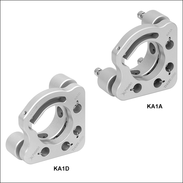 The KA1A and KA1D 3-Adjuster Ø1" PolarisKA Kinematic Mirror Mounts are designed to provide easy, high-resolution adjustment and the long-term alignment stability needed in industrial applications. These mounts feature a monolithic flexure arm that can be actuated using the included screw and a 0.05" (1.3 mm) hex key. The monolithic flexure arm design keeps wavefront distortion on the mounted optic to a minimum while providing a strong optic retention force. See the Test Data tab for more information on the distortion of the optic caused by the monolithic flexure arm. The three-adjuster design provides tip and tilt plus Z-axis (optical axis) adjustment. Two-adjuster versions are also available below.