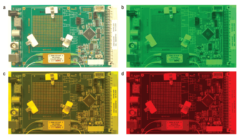Figure 1.3 An OSW22-633E optical switch kit is imaged using a CS165CU1 camera with an MVL8M23 lens and a series of machine vision filters to highlight different features. The images were taken with (a) no filter, (b) an MVF52A filter, (c) an MVF58A filter, and (d) an MVF66A filter.