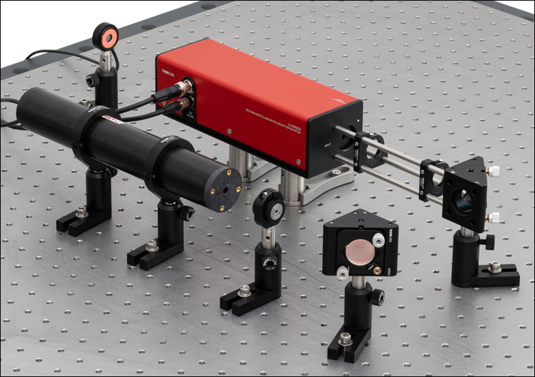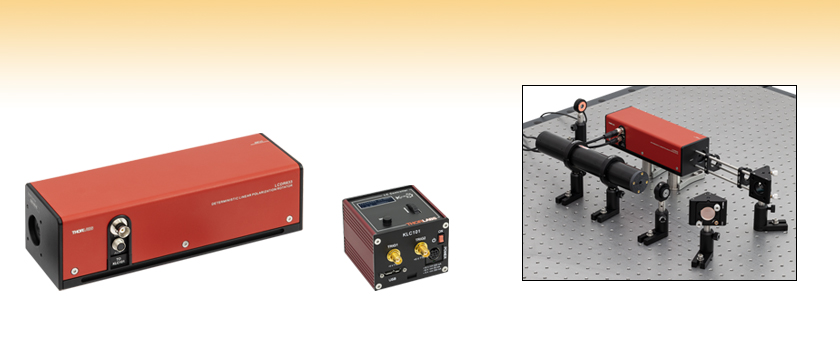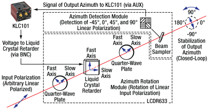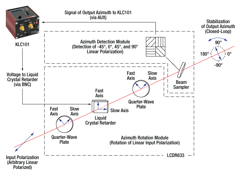 Thorlabs' LCDR633 Liquid Crystal Deterministic Rotator (LCDR), controlled by the KLC101 Liquid Crystal Controller, can continuously rotate the polarization state of an arbitrary linearly polarized input beam through over 360° with no mechanical movement involved. An internal closed-loop feedback mechanism analyzes the output beam and adjusts the driving voltage of the liquid crystal retarder to stabilize the output azimuth (as illustrated in Figure 1.2).