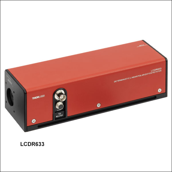 Thorlabs' LCDR633 Liquid Crystal Polarization Rotator accepts arbitrarily linearly polarized light and can rotate the output polarization through >360°. A feedback mechanism detects and stabilizes the azimuth of the output light. The rotator includes 1.5 m long BNC and Hirose cables for use with the KLC101 LC controller, which is required and sold separately below. The KLC101 controller that is used must be manufactured in 2025 or later (serial numbers larger than 39486044) and use firmware version 1.14.64 or higher. Earlier versions of this controller or those with older firmware will not function properly with the LCDR633 polarization rotator.