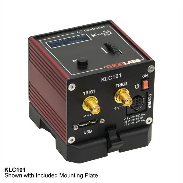 Thorlabs' KLC101 K-Cube Liquid Crystal Controller provides control of the LCDR633 liquid crystal polarization rotator and other liquid crystal devices. The digital display and controls on the top panel can be used to locally set the output voltage amplitude and frequency. The digital display includes a backlight that can be dimmed or turned off using the top panel menu options. Alternatively, a USB port allows the unit to be connected to a computer and controlled using the LCDR software (available in the Software tab above).