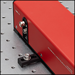 The LCDR features pairs of M4 x 0.7 and 8-32 mounting holes on either the bottom or side of the rotator housing for mounting to Ø1/2" optical posts or Ø1" pedestal posts. There are two sets on the bottom of the housing, one set centered on the housing and one set centered on the optical axis. The side-located mounting holes are ideal for spatially constrained systems where cable protrusion out of the side of the rotator is undesirable (in this case, the cables would connect to the top surface). Alternatively, two slots on either side of the rotator housing allow the LCDR to be mounted directly to an optical table with table clamps, such as our CL6 clamps (not included), as shown in Figure 1.4, resulting in a minimum beam height of 28.0 mm (1.10") while minimizing vibration and drift.