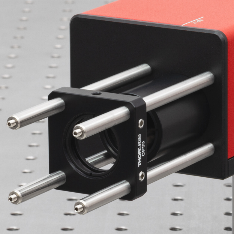 The input and output ports of the LCDR feature internal SM1 threading, which can be used to install externally SM1-threaded alignment targets or irises (not included). Both ports also have four 4-40 threaded holes for compatibility with our 30 mm cage systems. To aid in initial alignment, we recommend using cage assembly rods and our CP20D 30 mm cage system iris diaphragm, as shown in Figure 1.3.
