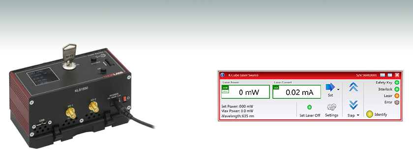 The KLS635 and KLS1550 K-Cube® laser sources are compact units with a fiber-coupled Fabry-Perot laser diode. The unit can be operated via the top panel display screen and controls as soon as the device is turned on. Alternatively, a USB connection allows for remote PC operation with the Kinesis software. An integrated feedback circuit maintains constant optical output power at the selected output intensity level.