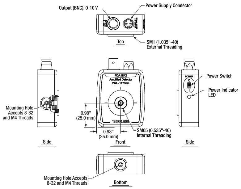 Every PDA or PDF series detector has internal SM05 (0.535"-40) threading and external SM1 (1.035"-40) threading, and the housing features universal taps that accept both 8-32 and M4. For more information about the location of these mounting points and mounting these units, please see the Housing Features tab. They include an SM1T1 lens tube, an SM1RR retaining ring, and a plastic dust cap that protects the active area when not in use (Item # SM1EC2B, replacements sold in packs of five). They also have the active area and responsivity curves marked on the back of the device, see Figure 1.4.