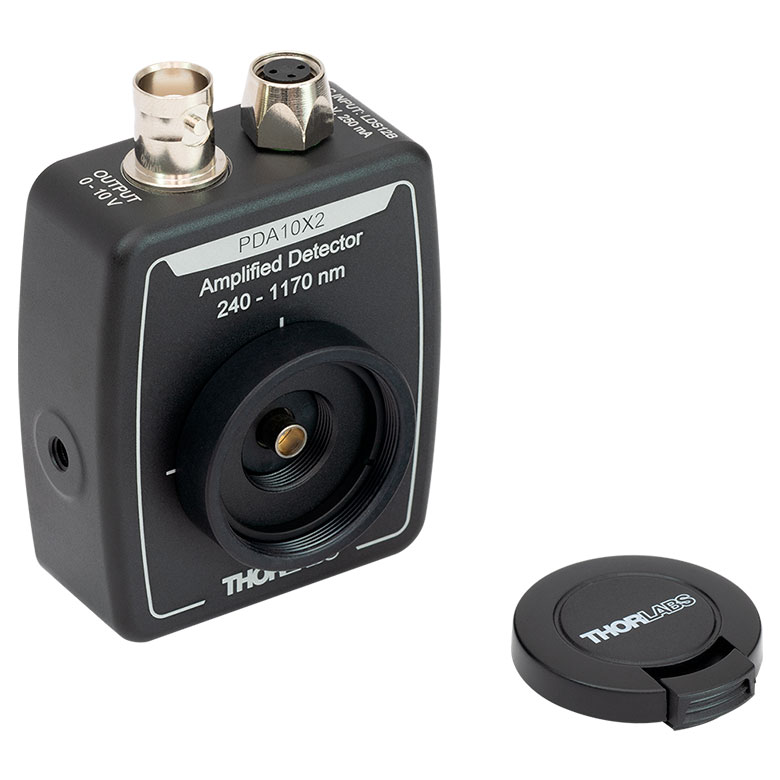 Our other switchable-gain devices with eight switchable maximum gain (bandwidth) combinations from 1.51 kV/A (11 MHz or 12 MHz for Item # PDA36Ax) to 4.75 MV/A (3 kHz) are the PDA100A2 detector, for detecting light from 320 to 1100 nm, and the PDA36A2 and PDA36AU detectors, for detecting light from 350 to 1000 nm. The PDA36AU detector is USB-powered and has a 16-bit DAQ with a 1 MS/s sampling that is used with a Windows PC running our PDA Software to read the detector signal and an additional analog input signal and to control the gain and trigger settings. The software functions as a virtual two-channel oscilloscope; please see the Software tab for details. The PDF10A2 with femtowatt sensitivity is a low-frequency device that should only be terminated into high impedance (Hi-Z) loads, while all of our other silicon amplified photodetectors are capable of driving loads from 50 Ω to Hi-Z. Please see the Specs tab for the full specifications of each device.