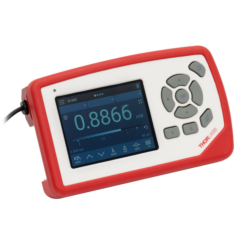 The PM100D2 and PM100D3 consoles are compatible with more than 40 photodiode, slim photodiode, integrating sphere, fiber, thermal, and pyroelectric sensors designed for use from the UV to the Mid-IR, with a bandwidth of up to 100 kHz, depending on the sensor and settings. The PM100D3 console is also compatible with our thermal position and power sensors. See the Sensor Selection tab for more information on compatible sensors, available for purchase below.