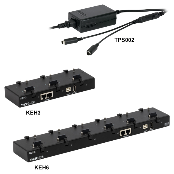 This K-Cube can be powered using our TPS002 power supply. If the TPS002 is used to power the KLD101, we do not recommend powering an additional K-Cube unit due the power supply's current limitations. Mutliple units can be connected to a single PC using the KEH3 or KEH6 Controller Hubs (available below) for applications involving multiple K-Cubes. The KEH3 features three controller mounting bays, while the KEH6 features six controller mounting bays. Note that these K-Cube drivers occupy two mounting bays on the controller hub.