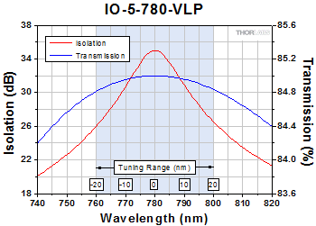 Figure 1.1 Our Adjustable Narrowband Isolators can be tuned to maximize the peak isolation for any wavelength within a narrow spectral range (shaded in this graph). See the Wavelength Tuning tab for more details.