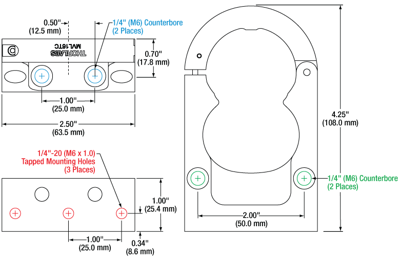 The MVL16TC(/M) can be mounted to our optical posts or breadboards using the two 1/4" (M6) counterbores on the base of the clamp, the two 1/4" (M6) counterbores on its front, or the three 1/4"-20 (M6 x 1.0) tapped mounting holes on its base. The individual mounting features are depicted in Figure G9.1. This design enables easy assembly of lens systems with a wide range of Thorlabs optomechanics, such as horizontal post-mounting, as shown in Figure G9.2, or vertical rail mounting, as shown in Figure G9.3.