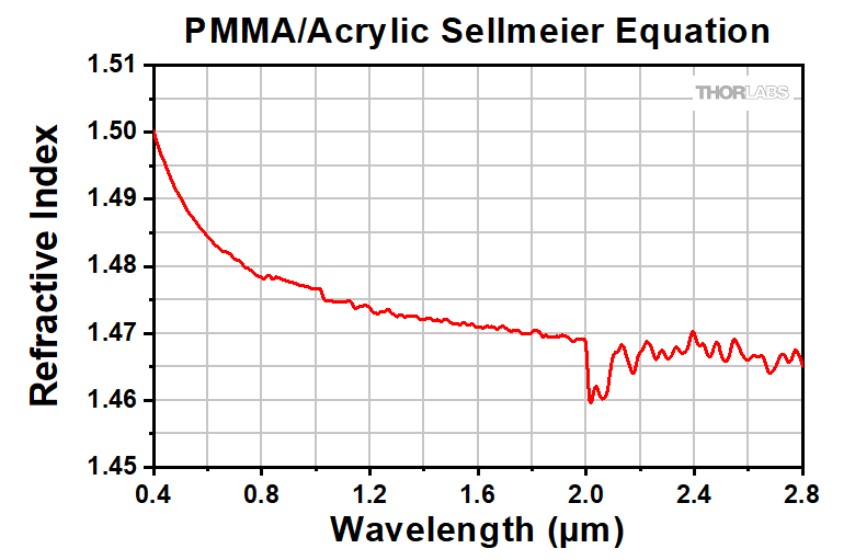 where λ is wavelength in μm and B1 , B2 , B3 , C1 , C2 , and C3 are constants unique to the material being tested. The Sellmeier equation used to plot N-BK7's index of refraction as a function of wavelength can be seen by clicking on the hyperlink in the footnote under the graph.