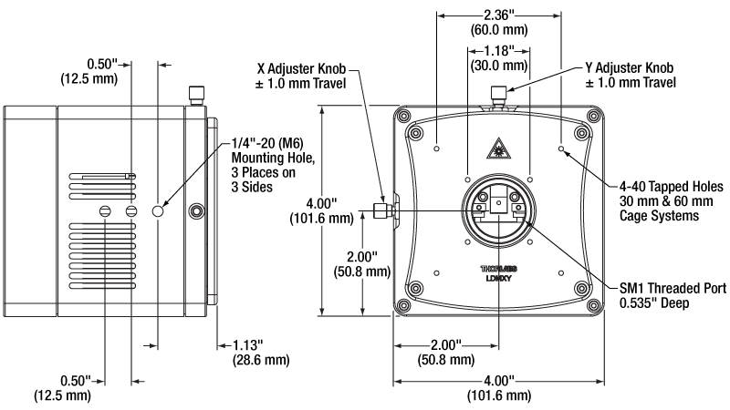 The laser is held in the mount such that the emission facet is nominally centered in the SM1-threaded (1.035"-40) port. This port is intended for mounting aspheric lenses for collimation purposes, using the proper adapter and lens. Z translation is achieved by rotating the adapter in the SM1 port with a spanner wrench. A pair of knurled knobs provides fine X-Y translation of this port so that the emitted laser beam can be precisely centered within it. This makes centering the laser beam onto collimating optics quick and easy. The translation is accomplished through the utilization of a flexure design. The front cover plate of the LDMC20 is equipped with eight 4-40 tapped holes for our 30 mm or 60 mm cage systems.