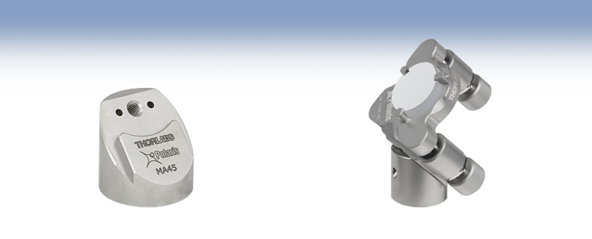 The POLARIS-MA45(/M) 45° Mounting Adapter securely mounts Ø1" or Ø25 mm Polaris Mirror Mounts at a 45° angle with respect to the optical table, breadboard, or working surface. The adapter has an 8-32 (M4) tap on the 45° face for securing the mirror mount, and a bottom-located 1/4"-20 (M6) tap for attachment to Ø1" Posts for Polaris Mounts. Two Ø2 mm alignment dowel pin holes around each tap are compatible directly with Ø1" posts for Polaris mounts, and allow for direct, precision mounting within custom or OEM systems (see Figure 1.3 for details).