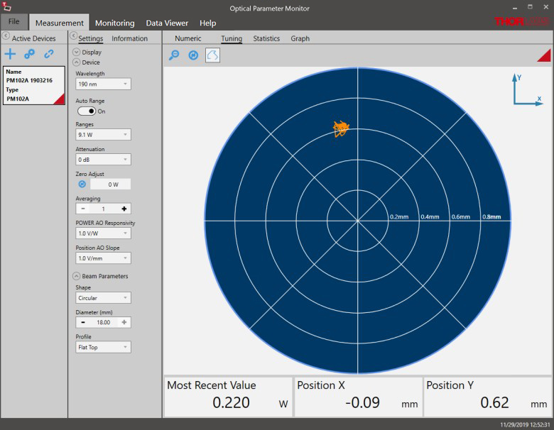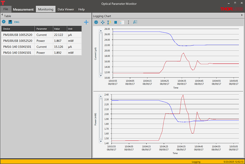 The PM60 and PM61 series power meters can be controlled remotely using Thorlabs' Optical Parameter Monitor (OPM) software. Both series feature a USB 2.0 interface to connect to a PC. Additionally, the PM61 series has a built in Bluetooth module that allows the user to establish a wireless connection to a PC. Remote connectivity allows the user to access the power meter settings, visualize power measurements, and record data directly through the OPM software. Please see the Software tab for details.