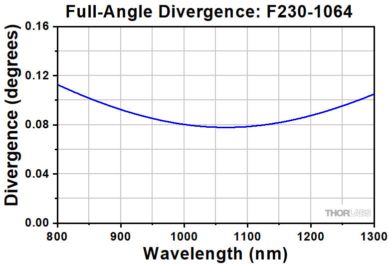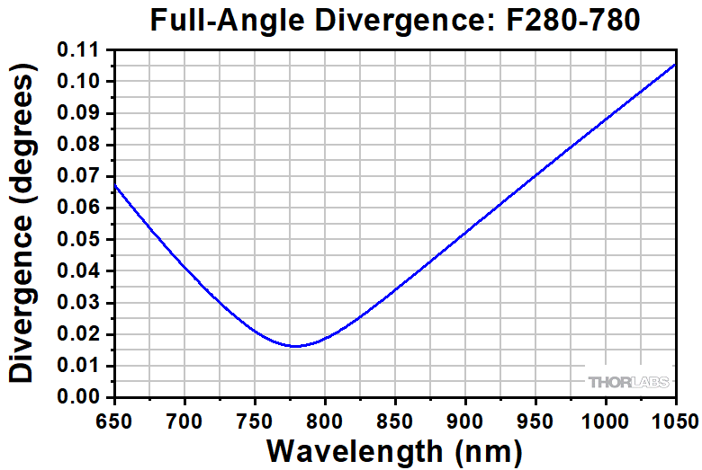 Simulations of the theoretical divergence when using one of our standard collimators at wavelengths other than the design wavelength are shown in the graphs below. For example, if you need to collimate 700 nm light from a fiber into a ~1.5 mm diameter beam, the F240FC-780 collimator (represented by the '-780' line in the F240 graph) can be used but will provide a higher divergence than at its design wavelength of 780 nm. Individual theoretical divergence plots and raw data are also available below for each collimator. Please contact Tech Sales to request a collimator aligned at a custom wavelength.