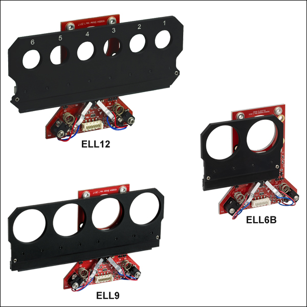 Thorlabs offers multi-position sliders with millisecond switching times enabled by Thorlabs' Elliptec® piezoelectric resonant motor technology. These sliders are available as standalone units, with the ELL9 and ELL12 sliders also available as a complete package that includes an ELLC interface board. Separate accessory packs are offered to upgrade standalone units to complete kits. Our compact and lightweight multi-position sliders all use the same custom-designed PCB and feature two motors. The motors are highly dynamic and have no gearing. As the motor includes no magnets, it is compatible with